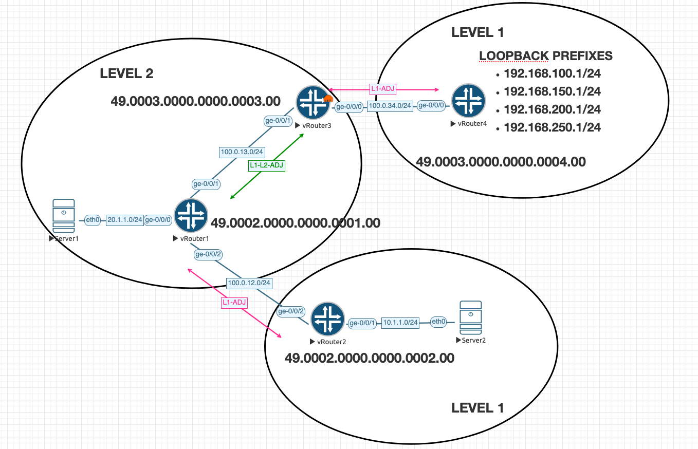 - Hierarchy: R1 and R3 form the Level 2 backbone. R2 and R4 are in separate Level 1 areas. R1 and R3 act as L1/L2 routers, connecting the levels.